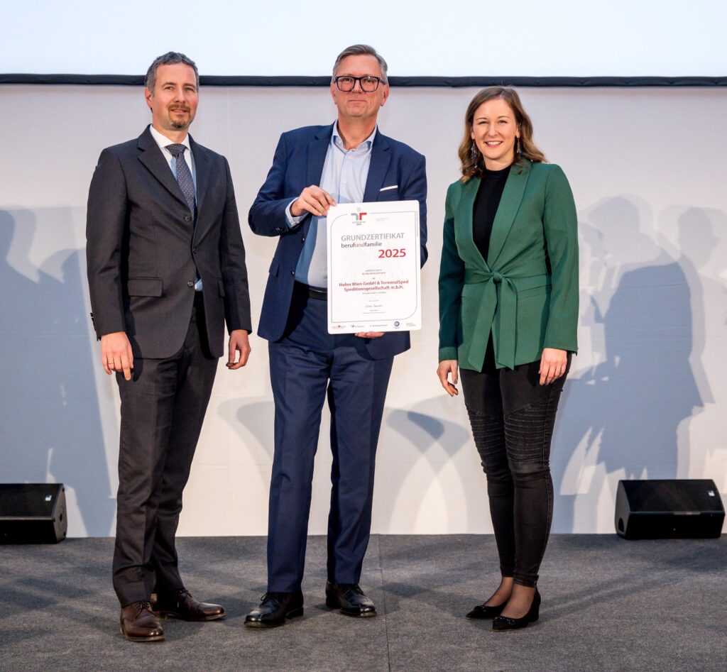 Im Sommer 2025 stieg der Hafen Wien ins Programm „Beruf & Familie ein und nun wurde im feierlichen Rahmen in der Aula der Wissenschaften das Zertifikat verliehen: Claudia Plakolm, Bundesministerin für Europa, Integration und Familie zeichnete 102 Unternehmen, Hochschulen sowie Gesundheits- und Pflegeeinrichtungen als besonders familienfreundlich aus - darunter auch den Hafen Wien und sein Tochterunternehmen, die TerminalSped Speditionsgesellschaft. Beide Unternehmen sind daher berechtigt, das staatliche Gütezeichen zu führen, welches sie als familienfreundliche Arbeitgeber ausweist.